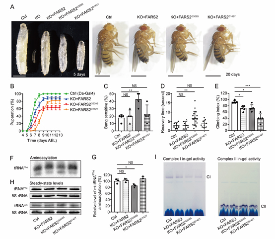 本研究利用CRISPR/CAS9技术以及UAS/GAL4系统,构建了FARS2缺陷的果蝇模型,发现FARS2缺陷果蝇存在明显的发育迟缓现象。且神经特异性FARS2缺陷的成年果蝇除发育迟缓以外,亦表现出了大脑变小和癫痫等表型。后续研究表明FARS2缺陷导致线粒体tRNAPhe氨酰化水平降低、线粒体tRNA代谢异常、线粒体复合体水平降低、呼吸链复合体酶活性降低,线粒体功能障碍进而影响细胞的生长发育。